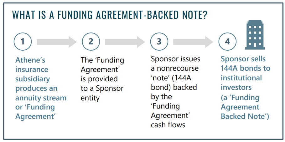 A new growth lever: FABNs. Fortitude just entered the Funding Agreement-Backed Note (FABN) market with an inaugural $500M issuance in October 2025. This is a key tool used aggressively by peers like Apollo’s Athene ($11B+ issued in 2024; almost $30b total from all funding agreements) to raise liabilities at scale from institutional investors. While this first deal is small, watch if Fortitude scales this channel; it could significantly expand its capacity to fund large reinsurance deals, further accelerating the growth of Carlyle’s advisory and fund fee base. From Athene’s 2022 Retirement Services update: