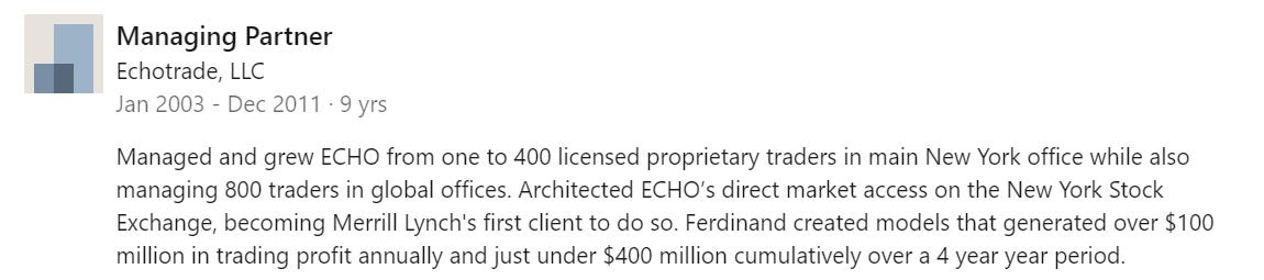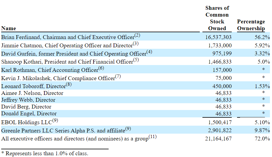 CEO Brian Ferdinand owns over half the company. His LinkedIn profile is interesting. I have not seen many public company CEOs with their name as their profile picture. He was also portfolio manager at Sharp Capital LP, managing a L/S book, from Sept 2001-Dec 2002 despite having finished undergrad at University of Kansas in 1999 and his Masters in Psychology at Fairleigh Dickinson in 2001. The stint at Sharp was followed by this: