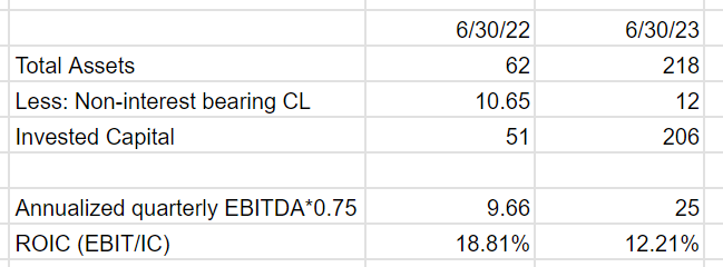 They are guiding to $48-60m EBITDA next year, let’s say they do $40m. As of 6/30/23, invested capital was ~$200m. Based on SoCF in the 6/30 10-Q it looks like like D&A is negligible. Maybe a 25% tax rate? 40*.75= $30m. 30/200 = 15%. There is a huge stock based comp number in the 10-Q but I am assuming this is one-time related to the various transactions they have done recently.