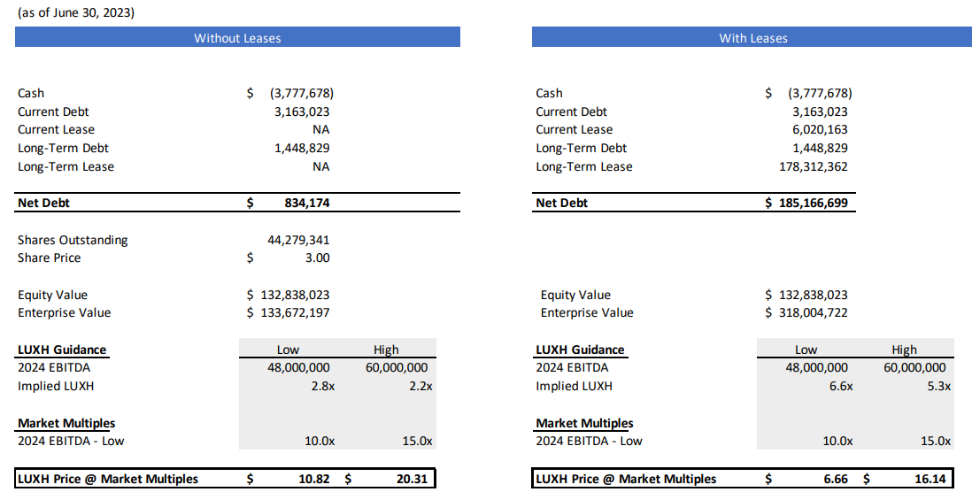 Shares outstanding increased from 26.5m as of the 2Q22 10-Q to 36m (44m including committed to be issued but not yet issued) as of the 2Q23 10-Q. I have not dug into what exactly caused this and whether it is likely to continue. I’m assuming it has to do with deals recently done with Greenle (and possibly other parties) to eliminate various forms of debt and improve the balance sheet.