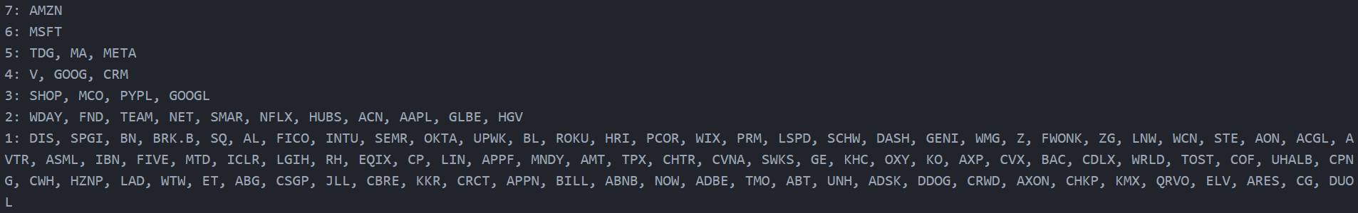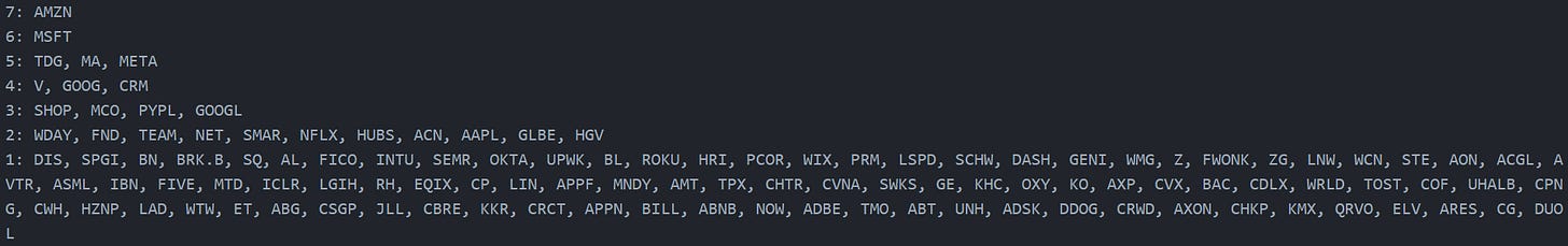 Basically, I wrote two scripts. The first does a series of API calls from the WhaleWisdom database, retrieving all holdings > 2.5% of the current portfolio from a list of funds that I follow and respect. The output of this ends up in a CSV file and is essentially a column of a couple hundred tickers. I then wrote another script where this information is put into an output like the one below, showing how often a ticker shows up among all those funds’ portfolios: