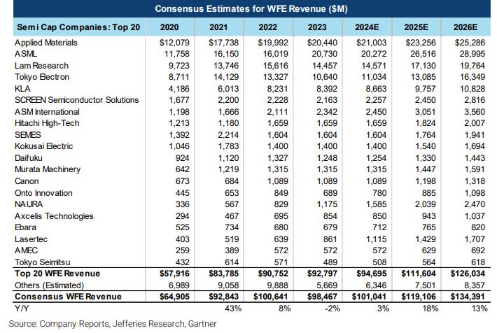 Bottoms-up consensus estimates for WFE companies reflect some big years in 2025 and 2026: